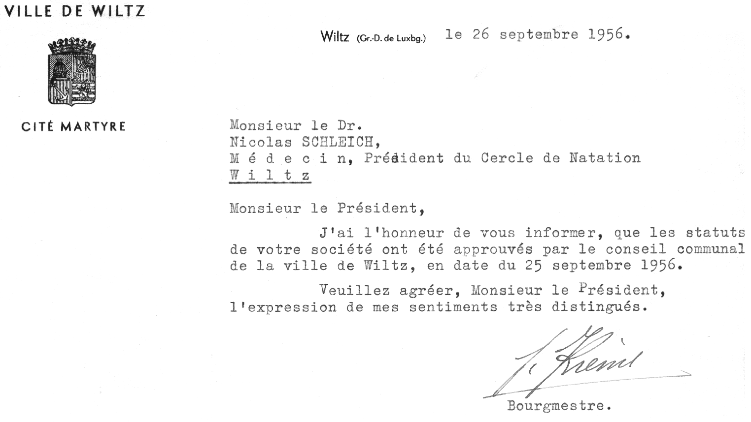 A second - and this time successful - effort to establish a swimming association was on July 23th, 1956 (see right) again initiated by Dr. Schleich. This time, the new founded association CNW a.s.b.l. gave themselves a statute, which was immediately confirmed by the communal administration (09/25/1956) [