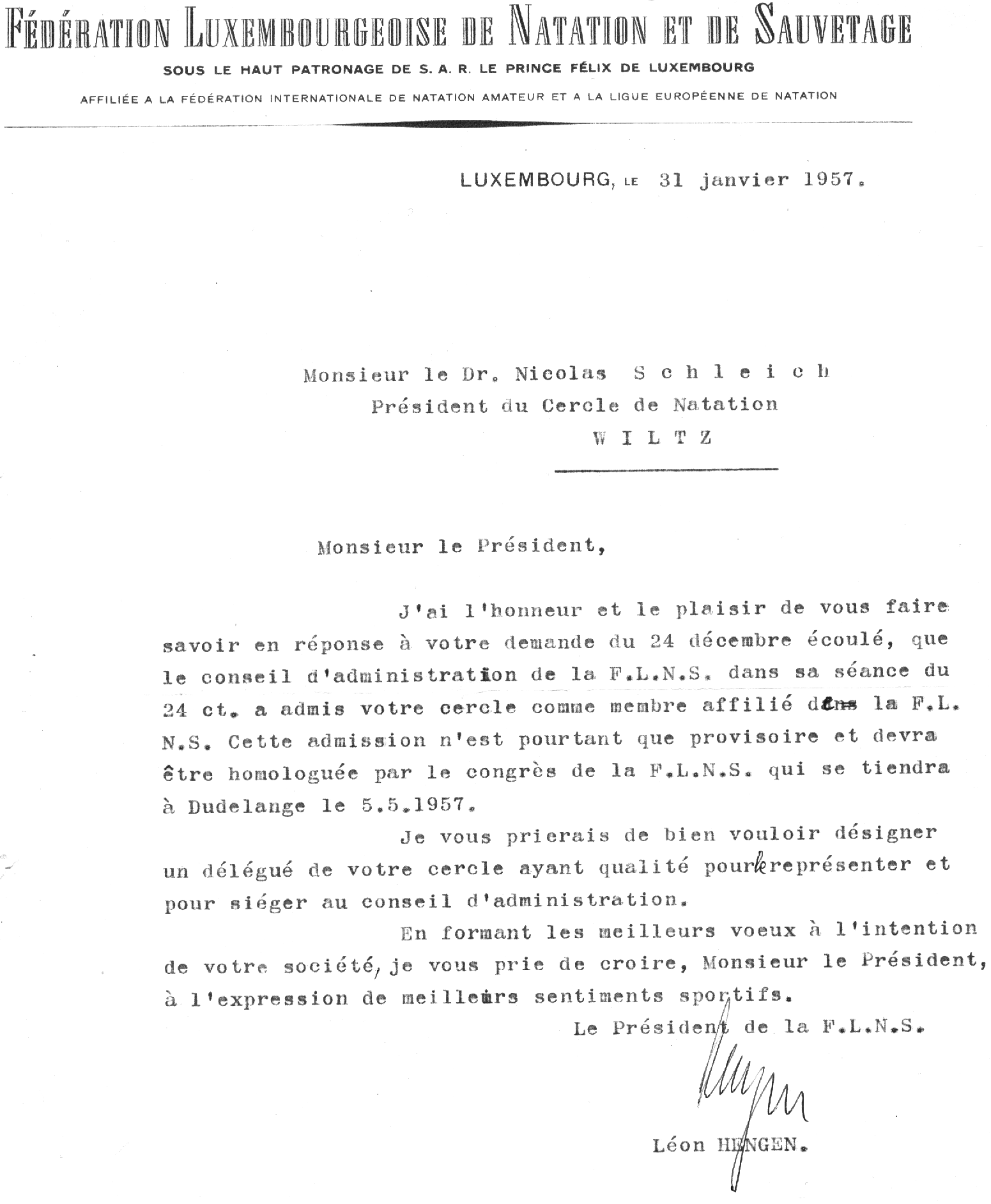 ]. Ausserdem stellte der neue Schwimmklub den Antrag zur Aufnahme in den Landesschwimmverbandes FNLS, der der Aufnahme am 24.01.1957 provisorisch zustimmte [
