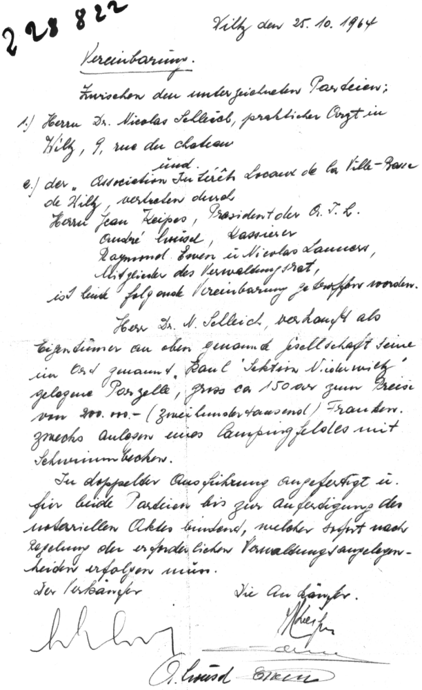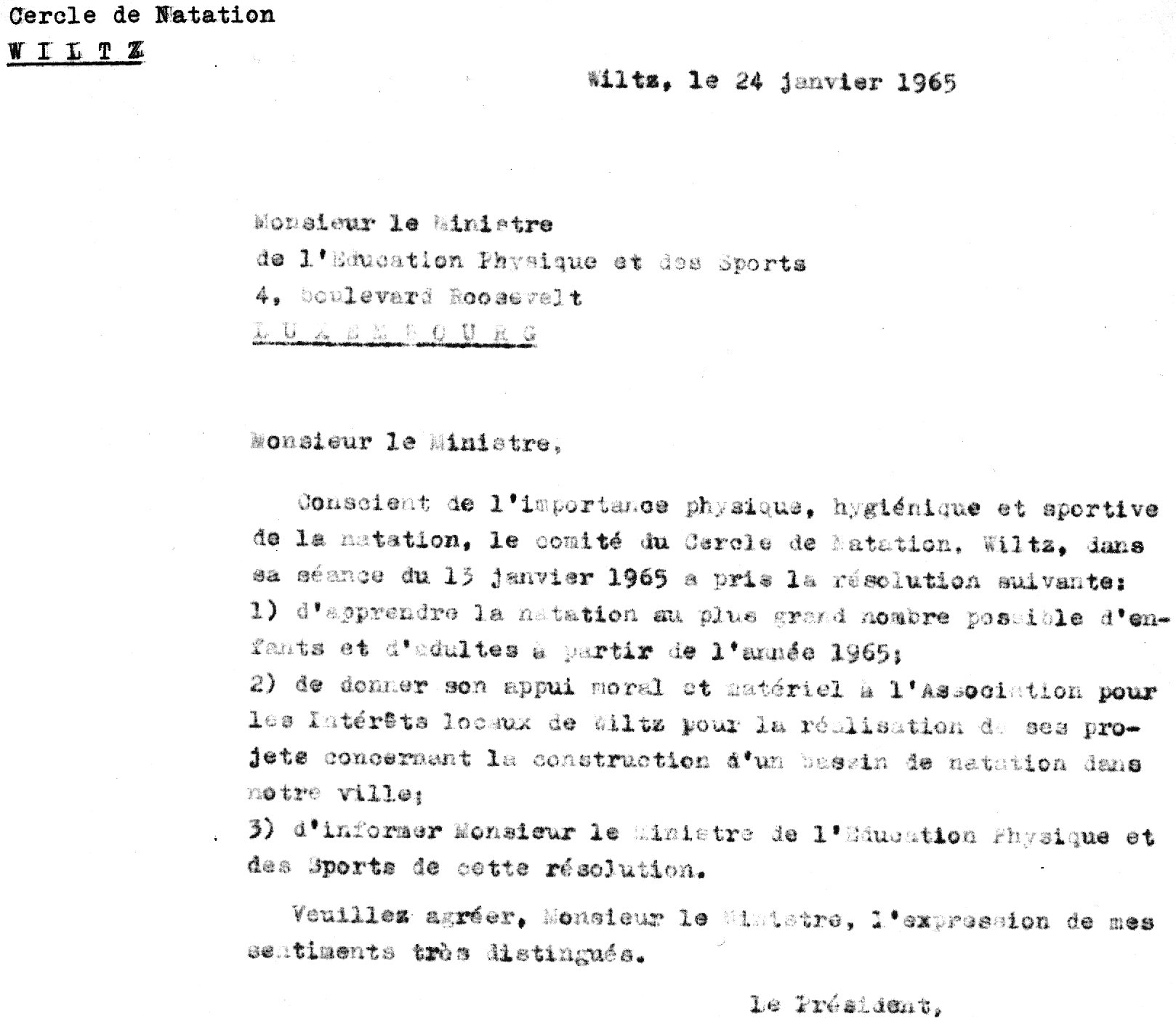 End of 1964 the association "A.I.L. - Association des Intérèts Locaux de la Ville-Basse" was founded in the downtown of Wiltz, with the aim to realize a camping area with swimming pool attached likewise in the area "In der Kaul". As the objective of both associations - AIL and CNW - was identical in the point of a the creation of a opportunity for swimming, the executive board of the "Cercle de Natation" decided in its meeting dated January 13th, 1965 to assist the AIL morally and materielly [