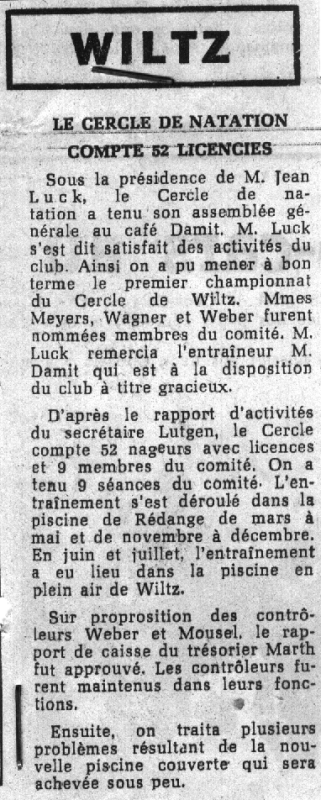 A first initiative to reactivate the swimming sport was in 1947 with the first foundation of a swimmming club "Cercle de Natation" under the presidence of Dr. Nicolas Schleich. Without any doubt, he can be called to be one of the pioniers of the swimming sport in Wiltz.